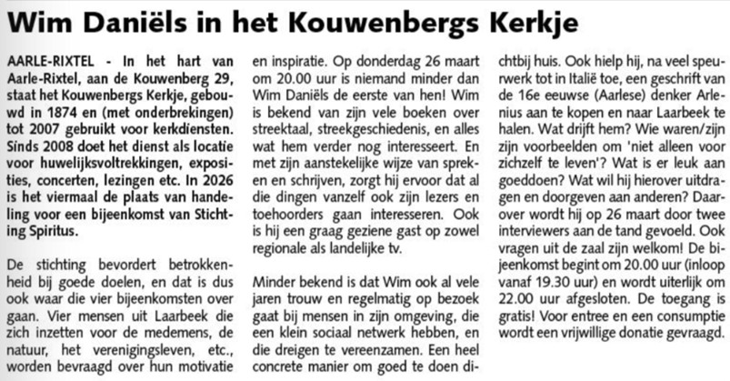 Inspiratieavond met Wim Daniels donderdag 26/3 20.00 uur